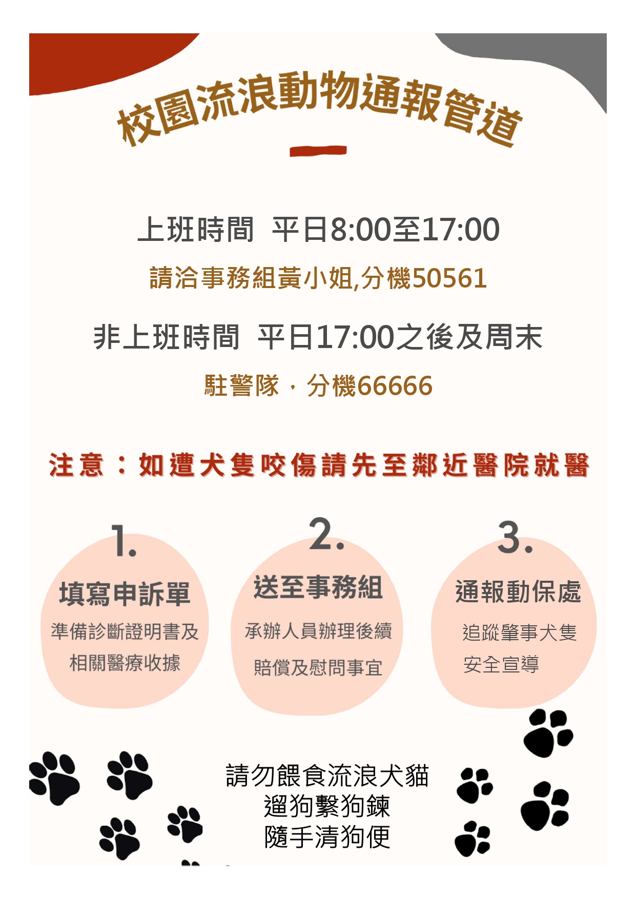 *若於校園內發現流浪動物(如犬貓)傷病,也可以填報通報單或直接撥打分機聯絡。